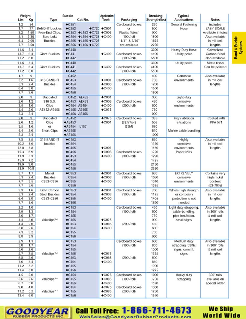 Weight Buckle Application Breaking Typical Lbs Kg Type Cat No. Tools Packaging Strength(lbs) Applications Notes 1.2 .54 xC251 Cardboard boxes 280 General Fastening includes 1.7 .77 BAND-IT buckles, xC252 xC720 xC001 or 500 Hose EASY SCALE 3.2 1.50 Free-End Clips, xC253 xL153 xC722 xC003 Plastic Totes* 900 Available in totes 5.1 2.30 Scru-Lokt xC254 xL154 xC724 xC400 100'/roll 1500 Also available 6.4 2.90 Buckles xC255 xL155 xC725 * 1/4" & 3/16" 1875 in mill coil 7.7 3.50 xC256 xL156 xC726 not available 2250 lengths 11.6 5.4 xG440 3300 Heavy Duty Hose Galvanized 13.7 6.4 Giant Buckles xG441 xG402 Cardboard boxes 4400 Utility poles Carbon Steel 17.2 8.0 xG442 (100'/roll) 5500 also available 11.6 5.4 xG440 3300 Utility poles Matte finish 13.7 6.4 Giant Buckles xG441 xG402 Cardboard boxes 4400 Can be painted 17.2 8.0 xG442 (100'/roll) 5500 1.7 .9 C452 400 Corrosive Also available 3.2 1.6 316 BAND-IT xC453 xC001 Cardboard boxes 750 environments in mill coil 5.1 2.4 Buckles xC454 xC003 (100'/roll) 1200 lengths 6.4 3.0 xC455 xC400 1500 7.7 3.6 xC456 1800 2.0 .9 Uncoated C452 AE452 xC001 300 Light-duty 2.6 1.2 316 S.S. xC453 AE453 xC003 Cardboard boxes 450 corrosive 3.5 1.6 Clips xC454 AE454 xC400 (200'/roll) 600 environments 4.4 2.0 AE452-AE456 xC455 AE455 xC075 750 5.3 2.4 xC456 AE456 900 2.0 .9 Uncoated AE452 xC075 Cardboard boxes 335 High vibration Coated with 2.6 1.2 Clips xAE453 xC001 (82.5'/roll) 505 situations PPA 571 3.5 1.6 or xAE454 L157 (25M) 670 4.4 2.0 Short Clips xAE455 840 Marine cable bundling 5.3 2.4 xAE456 1000 7.8 3.5 316 BAND-IT xC453 860 Highly Also available 10.2 4.6 buckles xC454 1160 corrosive in mill coil 12.8 5.8 xC455 xC001 1430 environments lengths 15.3 6.9 xC456 xC003 Cardboard boxes 1720 Paper Mills 11.9 5.3 xC453 xC400 (300'/roll) 1290 15.9 7.2 xC454 1725 19.9 9.0 xC455 2150 23.9 10.8 xC456 2580 3.7 1.7 Monel xC853 xC001 Cardboard boxes 630 EXTREMELY Contains very 5.1 2.4 Buckles C854 xC003 (100'/roll) 1050 corrosive high nickel 7.7 3.5 C853-C856 xC855 xC400 1310 environments content 7.7 3.6 C856 1595 (63-70%) 3.3 1.6 Galv. Carbon xC353 xC001 Cardboard boxes 700 Where high strength Also available 5.1 2.4 Steel Buckles xC354 xC003 (100'/roll) 1125 or corrosion in mill coil 6.4 3.0 C353-C356 xC355 xC400 1405 protection is not lengths 7.7 3.6 xC356 1690 needed 2.2 1.0 xC153 Cardboard boxes 450 Light duty strapping, Also available 2.9 1.3 xC154 (100'/roll) 600 cable-bundling, in 300' rolls 3.6 1.7 xC155 750 pipe insulation, & mill coil 4.4 2.0 ValuclipsTM xC156 xC075 900 small signs lengths 4.4 2.0 xC153 xC085 (200'/roll) 450 5.8 2.6 xC154 xC400 600 7.3 3.2 xC155 750 8.8 3.9 xC156 900 Band&Buckle 2.9 1.3 xC153 Cardboard boxes 600 Medium duty Also available Systems 3.8 1.7 xC154 (100'/roll) 850 strapping, traffic in 300' rolls 5.6 2.6 xC155 1000 signs, comml. & mill coil 5.7 2.5 ValuclipsTM xC156 xC075 1275 signs lengths 5.8 2.6 xC153 xC085 (200'/roll) 600 7.6 3.4 xC154 xC400 850 11.2 5.2 xC155 1000 11.4 5.0 xC156 1275 4.5 2.0 xC154 xC075 Cardboard boxes 1000 Heavy duty 300' rolls 5.6 2.6 ValuclipsTM xC155 xC085 (100'/roll) 1250 strapping available on 6.7 3.0 xC156 xC400 1590 special order 9.0 4.0 xC154 xC075 Cardboard boxes 1000 11.2 5.2 ValuclipsTM xC155 xC085 (200'/roll) 1250 13.4 6.0 xC156 xC400 1590 9