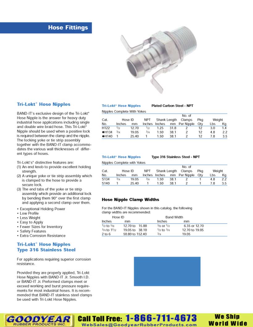 Hose Fittings � Tri-Lokt Hose Nipples Tri-Lokt� Hose Nipples Plated Carbon Steel - NPT BAND-IT's exclusive design of the Tri-Lokt� Nipples Complete With Yokes No. of Hose Nipple is the answer for heavy duty Cat. Hose ID NPT Shank Length Clamps Pkg Weight industrial hose applications including single No. Inches mm Inches Inches mm Per Nipple Qty Lbs Kg and double wire braid hose. This Tri-Lokt� H122 1/2 12.70 1/2 1.25 31.8 2 12 3.0 1.4 Nipple should be used when a positive lock xH134 3/4 19.05 3/4 1.50 38.1 2 12 4.8 2.2 is required between the clamp and the nipple. xH140 1 25.40 1 1.50 38.1 2 12 7.8 3.5 The locking yoke or tie strip assembly together with the BAND-IT clamp accommo- dates the various wall thicknesses of differ- ent types of hoses. Tri-Lokt� Hose Nipples Type 316 Stainless Steel - NPT Tri-Lokt's� distinctive features are: Nipples Complete with Yokes (1) An end knob to provide excellent holding No. of strength. Cat. Hose ID NPT Shank Length Clamps Pkg Weight (2) A unique yoke or tie strip assembly which No. Inches mm Inches Inches mm Per Nipple Qty Lbs Kg S134 3/4 19.05 3/4 1.50 38.1 2 1 4.8 2.2 is clamped to the hose to provide a S140 1 25.40 1 1.50 38.1 2 1 7.8 3.5 secure lock. (3) The end tabs of the yoke or tie strip assembly which provide an additional lock by bending them 90� over the first clamp Hose Nipple Clamp Widths and applying a second clamp over them. � Exceptional Holding Power For the BAND-IT Nipples shown in this catalog, the following clamp widths are recommended: � Low Profile � Less Weight Hose ID Band Width Inches mm Inches mm � Easy to Apply 1/2 to 5/8 12.70 to 15.88 3/8 or 1/2 6.35 or 12.70 � Fewer Sizes for Inventory 3/4 to 11/2 19.05 to 38.10 1/2 to 3/4 12.70 to 19.05 � Safety Features 2 to 6 50.80 to 152.40 3/4 19.05 � Extra Corrosion Resistance � Tri-Lokt Hose Nipples Type 316 Stainless Steel For applications requiring superior corrosion resistance. Provided they are properly applied, Tri-Lokt Hose Nipples with BAND-IT Jr. Smooth I.D. or BAND-IT Jr. Preformed clamps meet or exceed working and burst pressure require- ments for most industrial hoses. It is recom- mended that BAND-IT stainless steel clamps be used with Tri-Lokt Hose Nipples. 38